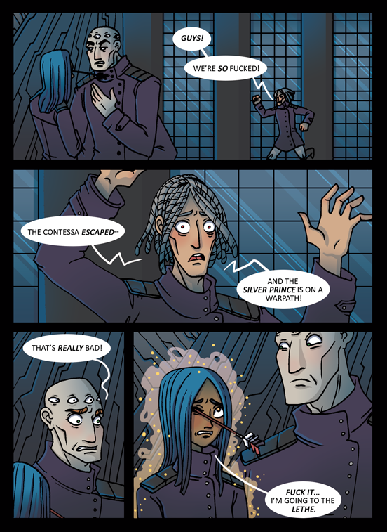 What are the odds that one of these three people is the Contessa? The new arrival with bad news is the obvious guess. Perhaps the guy with the performance-enhancing arrow in the eye is the real Contessa with no shoes?